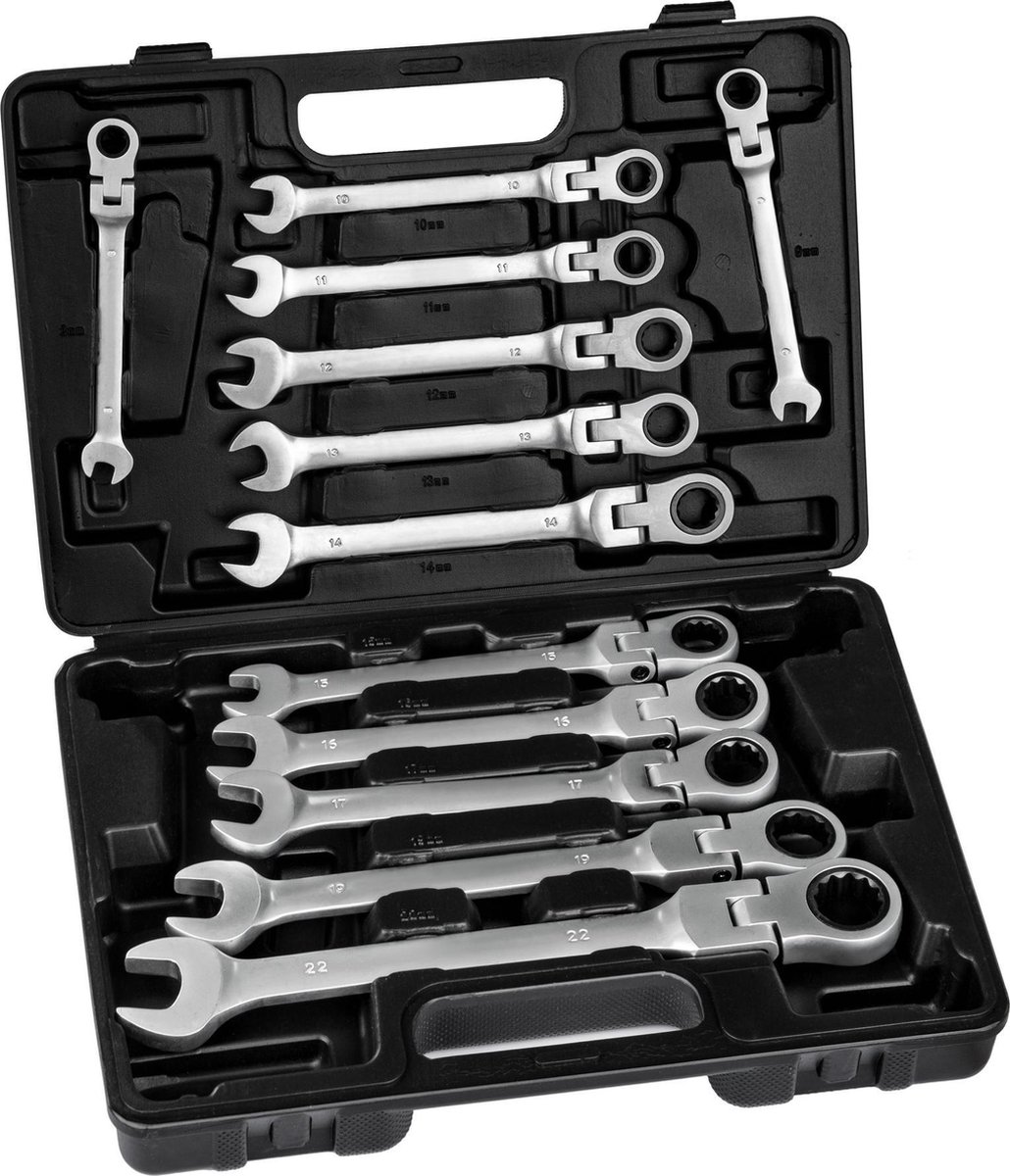 Het gebruik van de TecTake Steeksleutelset 12-delig maakt het werken aan moeilijk bereikbare plaatsen een stuk gemakkelijker. De gereedschapset bevat 12 stevige steeksleutels met flexibele scharnierkoppen, waarmee uw projecten of reparaties snel en efficiënt kunnen worden uitgevoerd. De steeksleutels zijn gemaakt van duurzaam chroom vanadium-staal en bieden een robuuste en lange levensduur. Om de set compleet te maken, wordt deze geleverd met een stabiele koffer van kunststof, waarin alle sleutels overzichtelijk zijn geordend. Deze steeksleutelset is geschikt voor zowel doe-het-zelvers als professionals. De flexibele scharnierkoppen bieden een grote mate van bewegingsvrijheid en een betere toegang tot lastig bereikbare schroefverbindingen. Het ergonomische handvat is zacht en comfortabel om te hanteren, waardoor er een optimale grip wordt verkregen. Met de TecTake Steeksleutelset 12-delig bent u goed voorbereid op elke uitdaging.